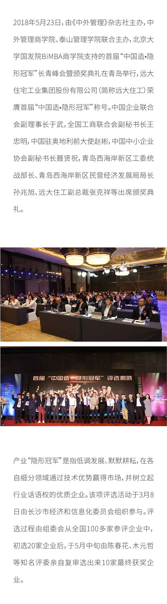 远大住工荣膺首届“中国造?隐形冠军”