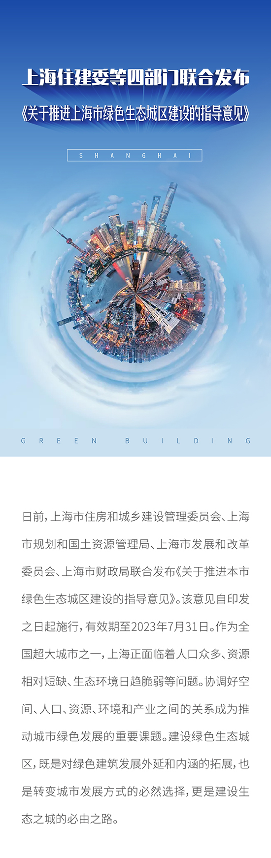 上海住建委等四部门联合发布 《关于推进上海市绿色生态城区建设的指导意见》