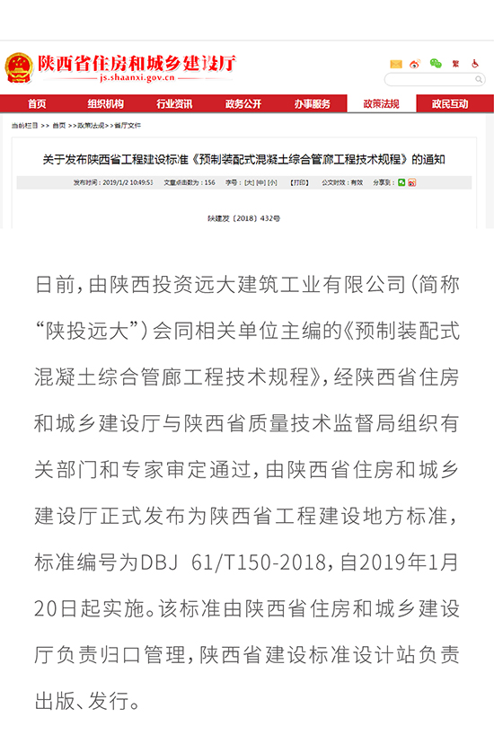 陕投远大主编《预制装配式混凝土综合管廊工程技术规程》 由陕西省住建厅发布实施