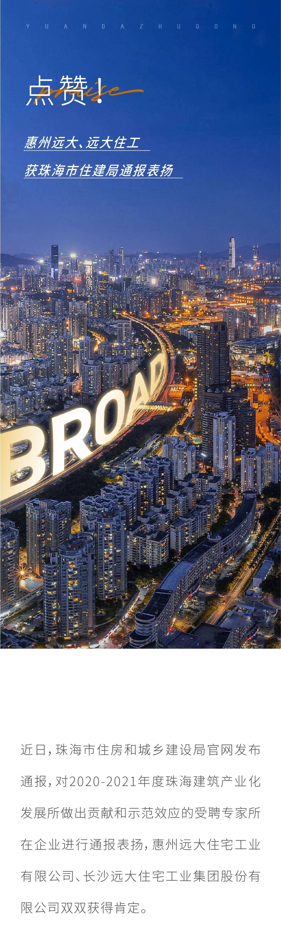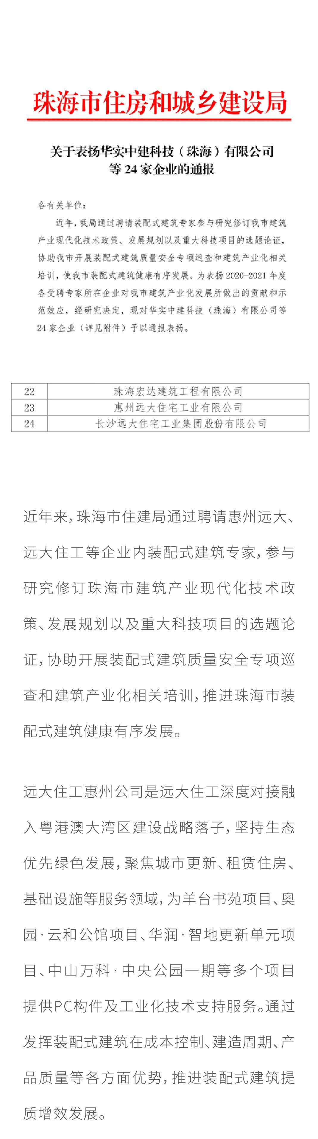 点赞!惠州远大、远大住工获珠海市住建局通报表扬